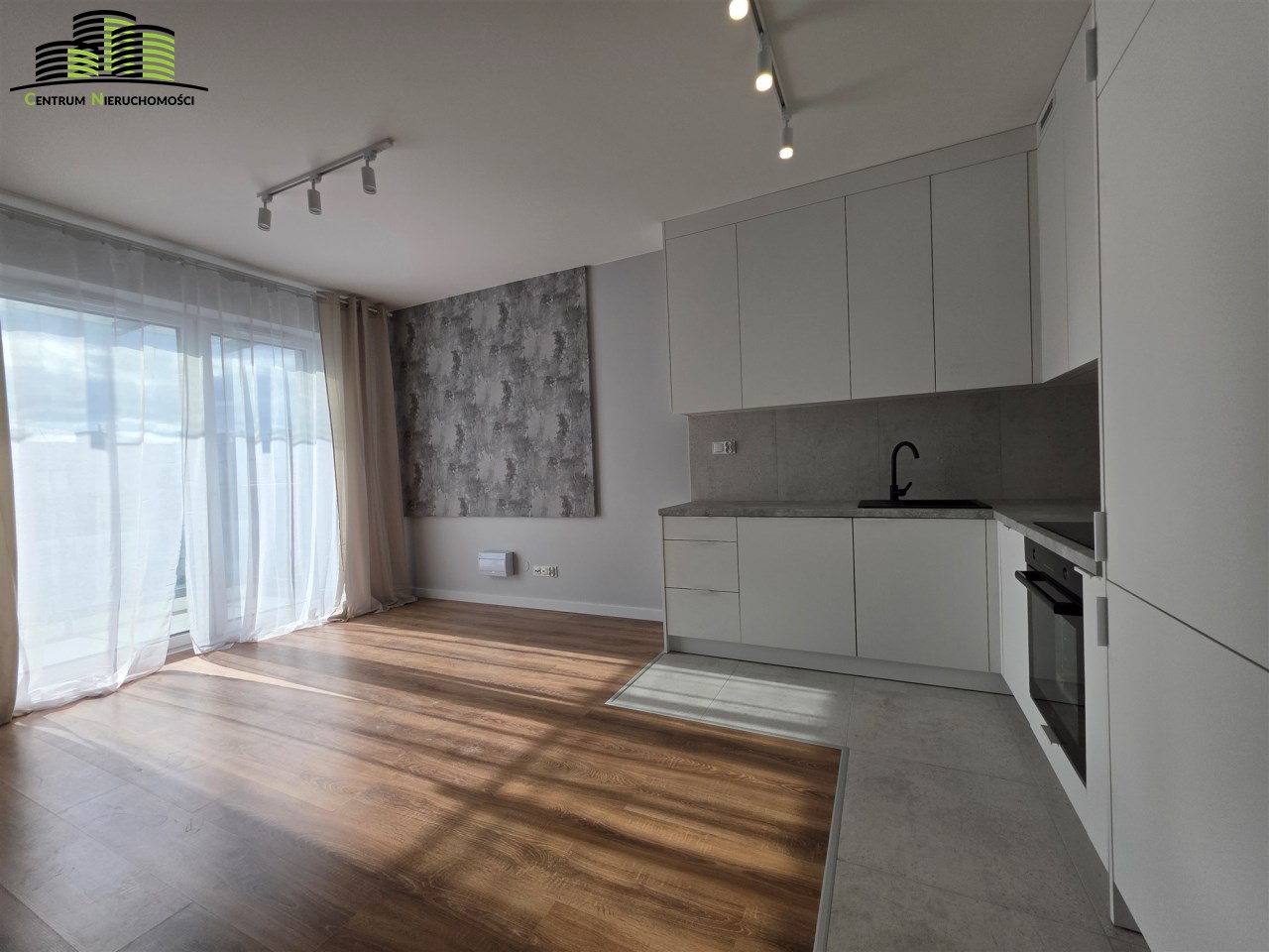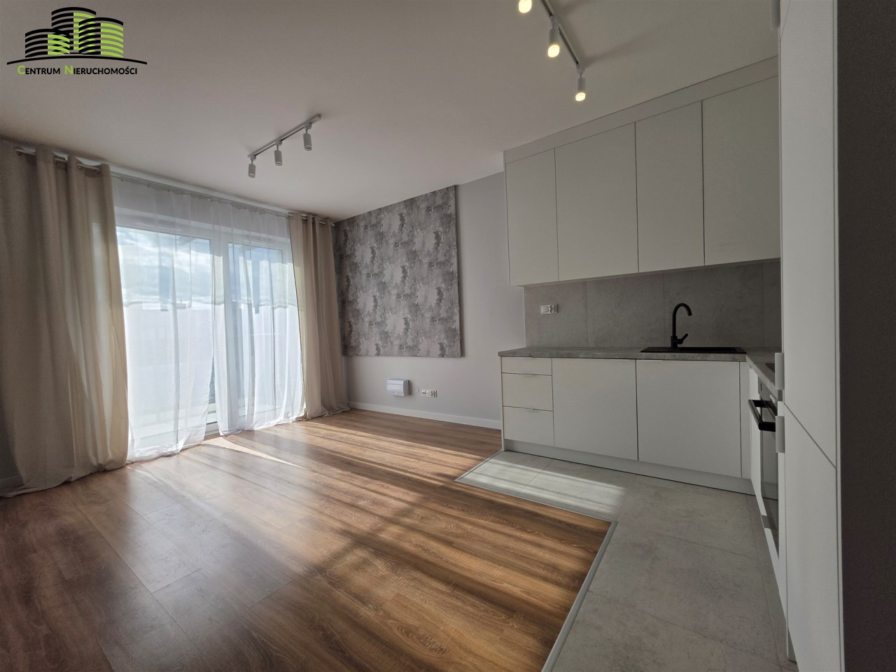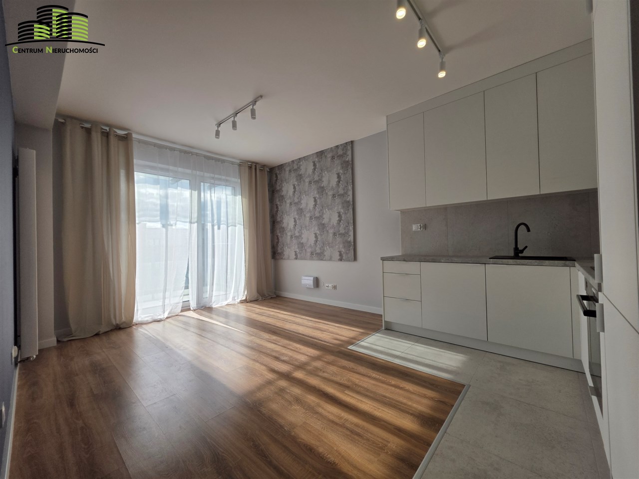 - Salon z nowoczesnym aneksem kuchennym i wyjściem na balkon.