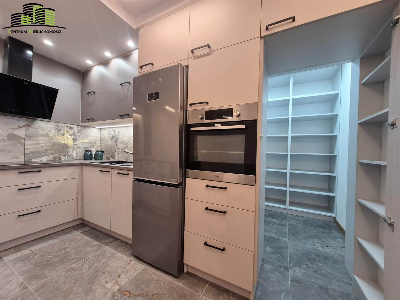 Kuchnia została zaprojektowana z myślą o wygodzie osób, które cenią wysoką jakość i funkcjonalność. W zabudowie znajdują się sprzęty klasy premium, a dodatkowym atutem jest przylegająca spiżarnia, idealna do przechowywania zapasów i sprzętów kuchennych. Dzięki temu strefa dzienna pozostaje uporządkowana i przestronna.