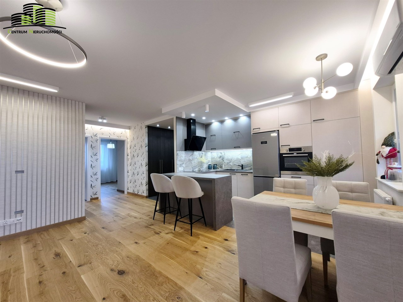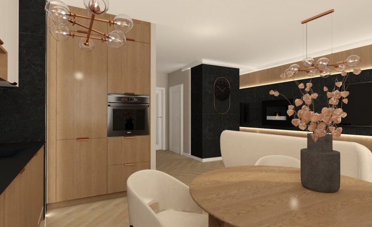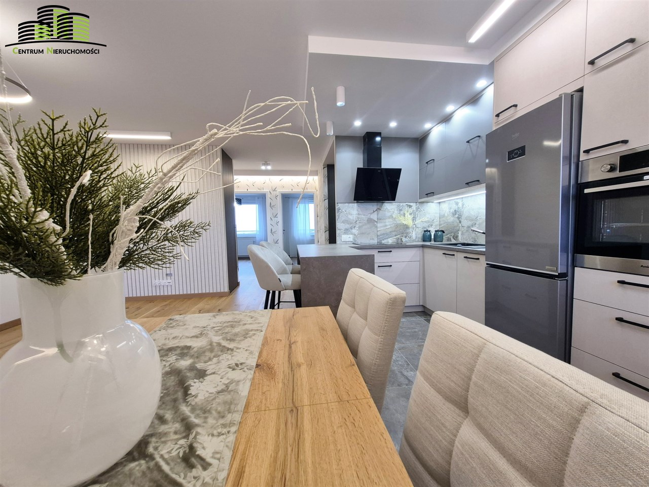 Mieszkanie ma powierzchnię 65 m² i zostało urządzone w wysokim standardzie z dbałością o każdy detal. Wnętrza są jasne, spójne stylistycznie i funkcjonalne. Naturalnym centrum mieszkania jest przestronny salon połączony z aneksem kuchennym, tworzący wygodną strefę dzienną. Duże okna oraz wyjście na duży, w pełni przeszklony balkon zapewniają imponujący widok na panoramę miasta oraz doskonałe doświetlenie wnętrz.