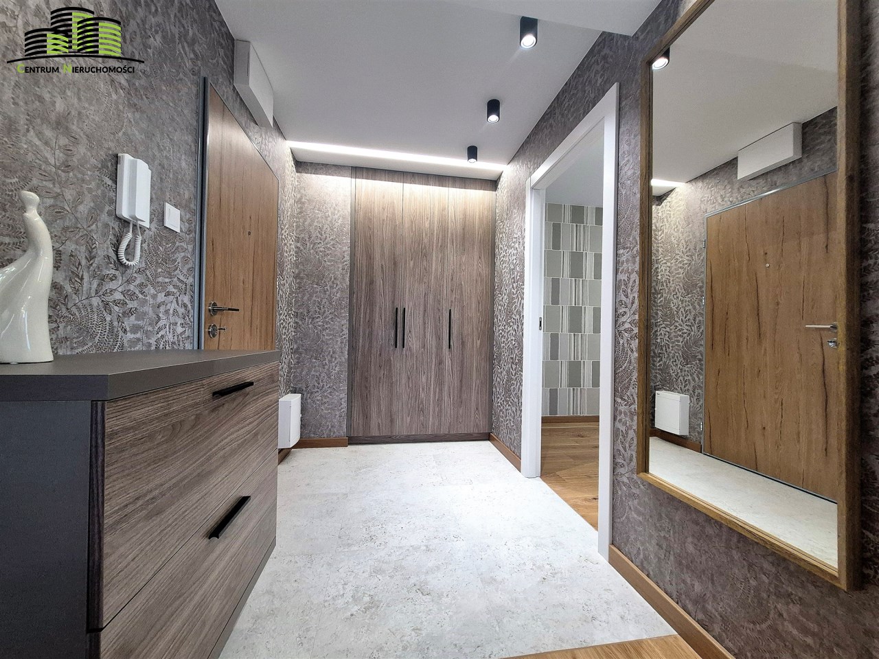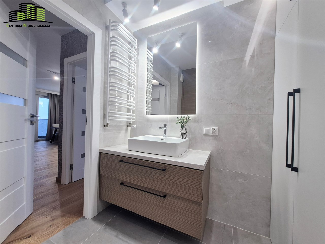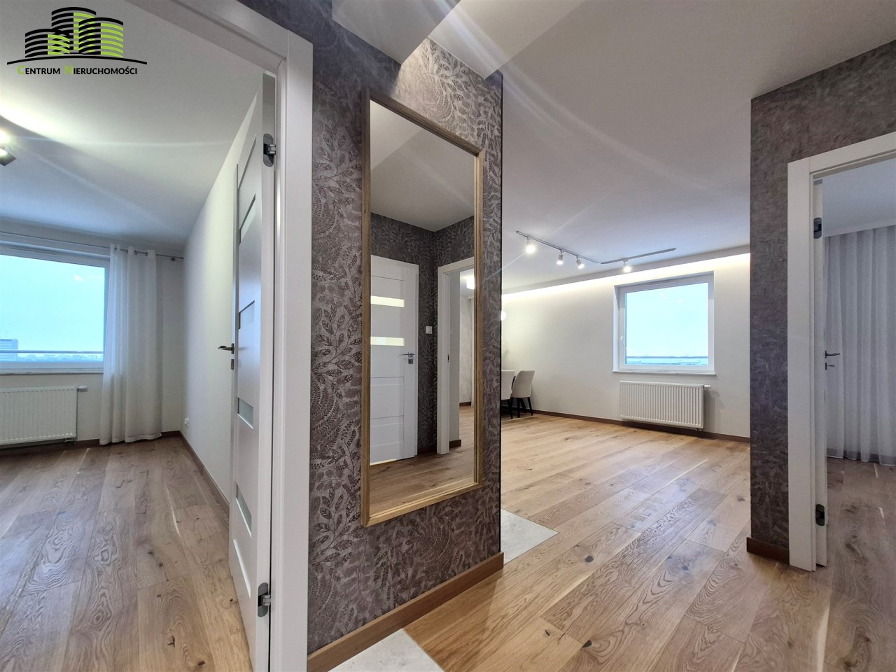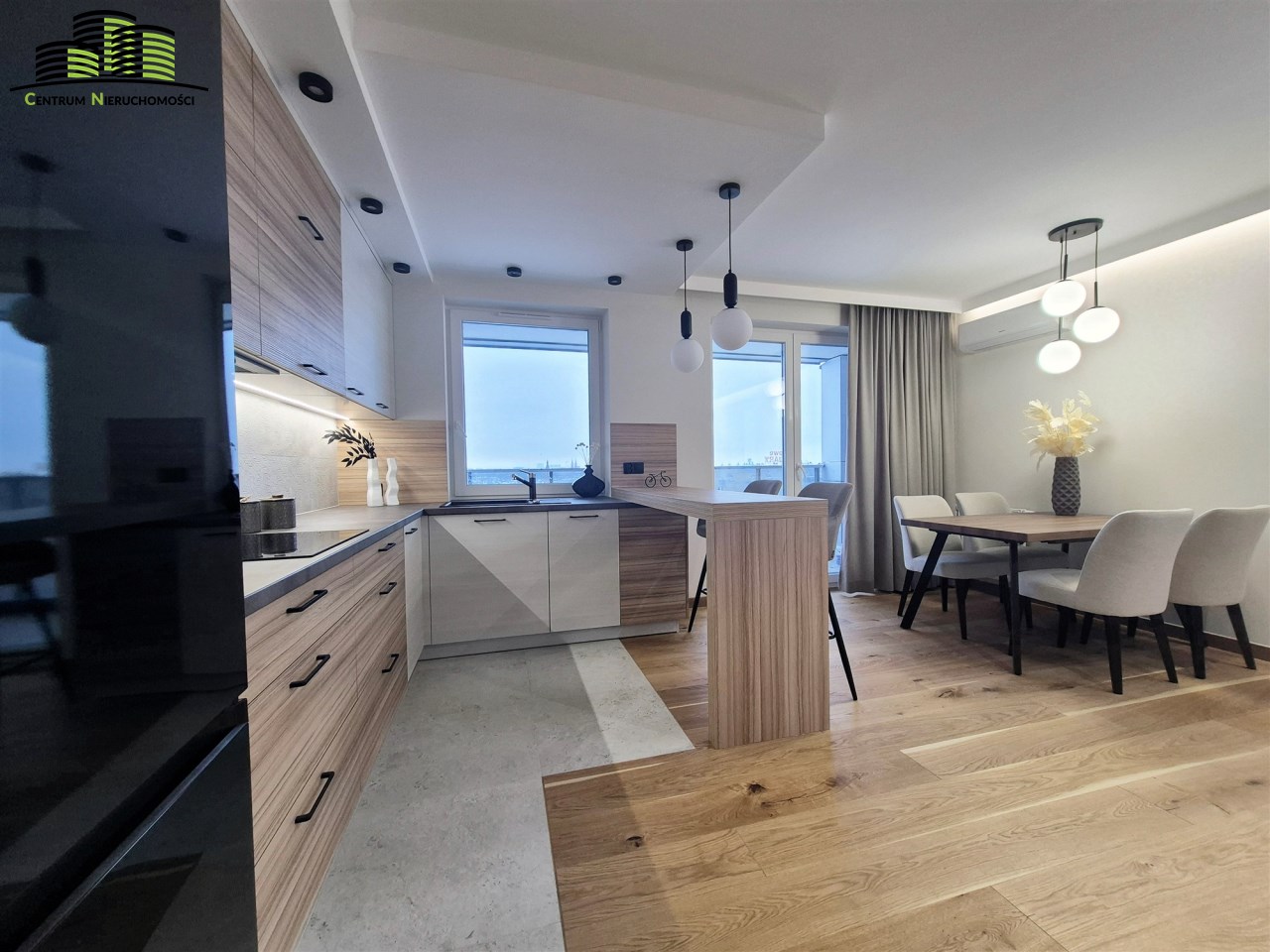 Mieszkanie ma powierzchnię 64 m² i zostało urządzone w wysokim standardzie z dbałością o każdy detal. Wnętrza są jasne, spójne stylistycznie i funkcjonalne. Naturalnym centrum mieszkania jest przestronny salon połączony z aneksem kuchennym, tworzący wygodną strefę dzienną. Duże okna oraz wyjście na duży, w pełni przeszklony balkon zapewniają imponujący widok na panoramę miasta oraz doskonałe doświetlenie wnętrz.