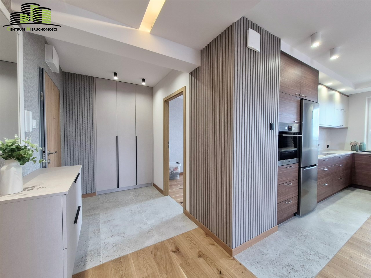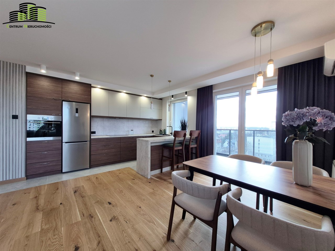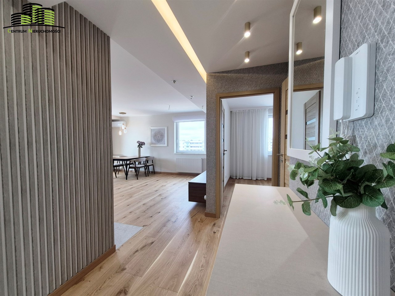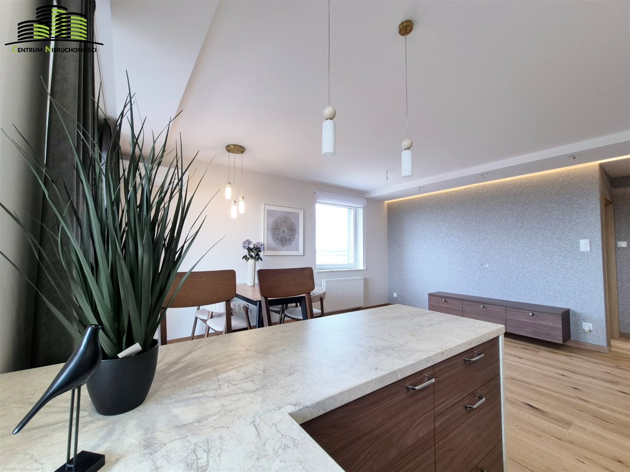 Mieszkanie ma powierzchnię 64 m² i zostało urządzone w wysokim standardzie z dbałością o każdy detal. Wnętrza są jasne, spójne stylistycznie i funkcjonalne. Naturalnym centrum mieszkania jest przestronny salon połączony z aneksem kuchennym, tworzący wygodną strefę dzienną. Duże okna oraz wyjście na duży, w pełni przeszklony balkon zapewniają imponujący widok na panoramę miasta oraz doskonałe doświetlenie wnętrz.