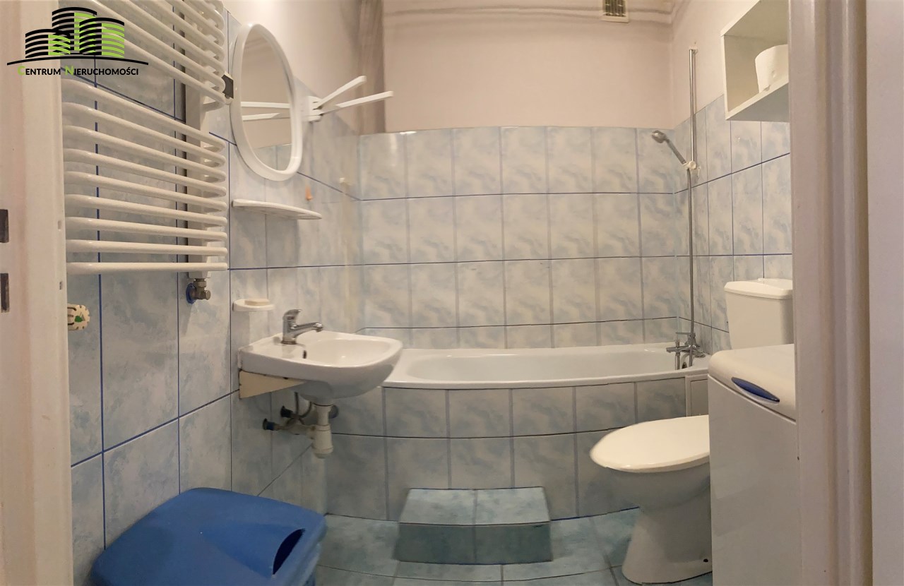 - w łazience znajduję się wanna, umywalka, szafka, a ze sprzętów: pralka,
