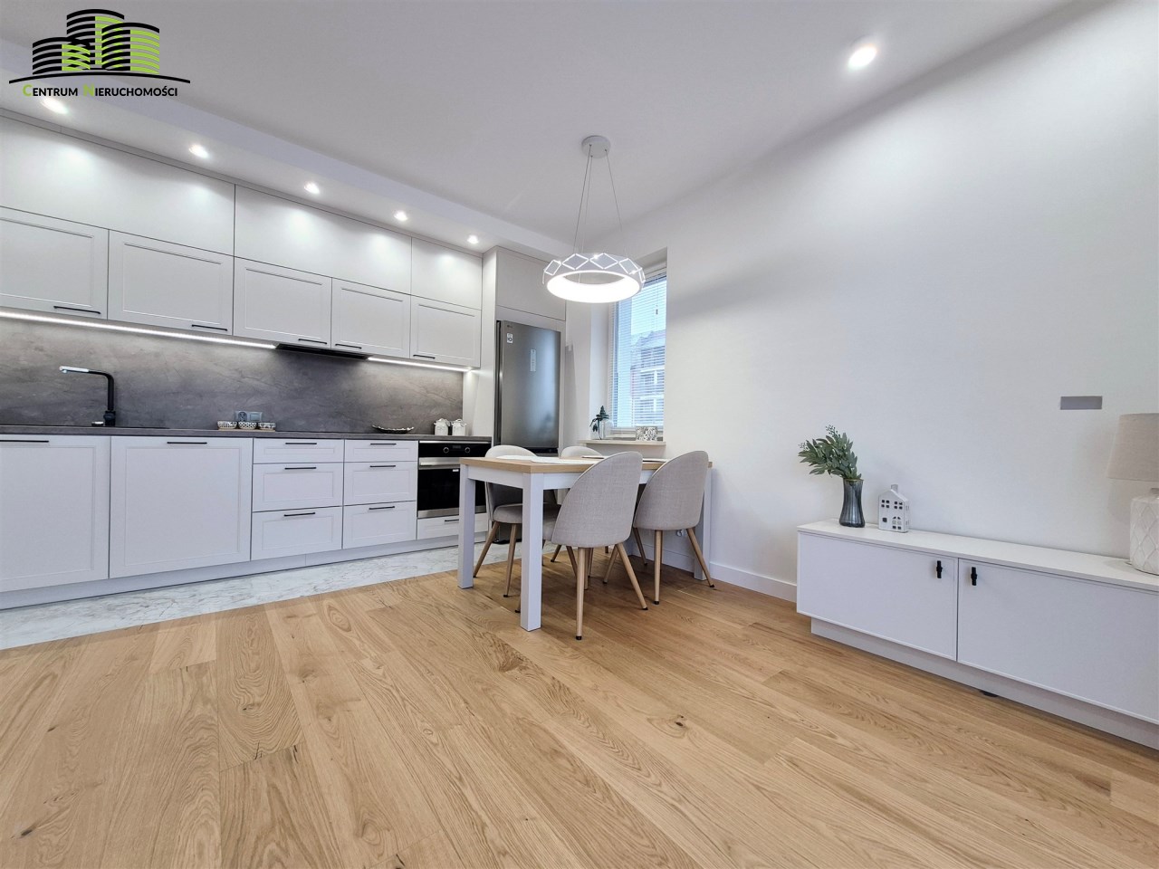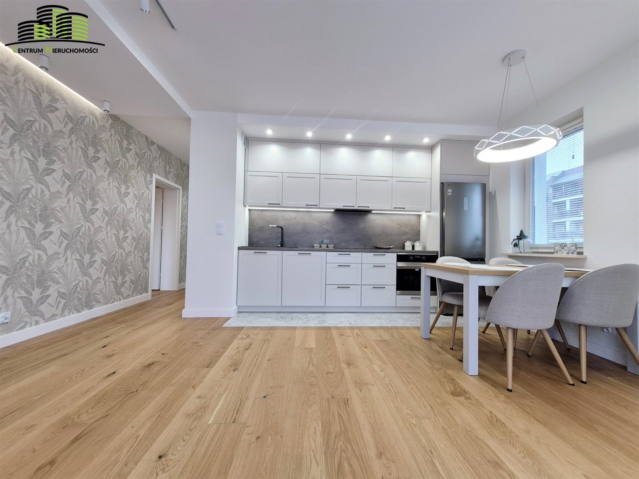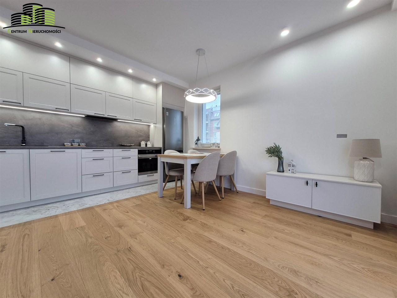 Salon z aneksem kuchennym – przestronny, słoneczny, z wyjściem na narożny balkon. Aneks wyposażony w nowoczesną zabudowę meblową i wysokiej klasy sprzęt AGD (zmywarka, płyta indukcyjna, piekarnik, lodówka).