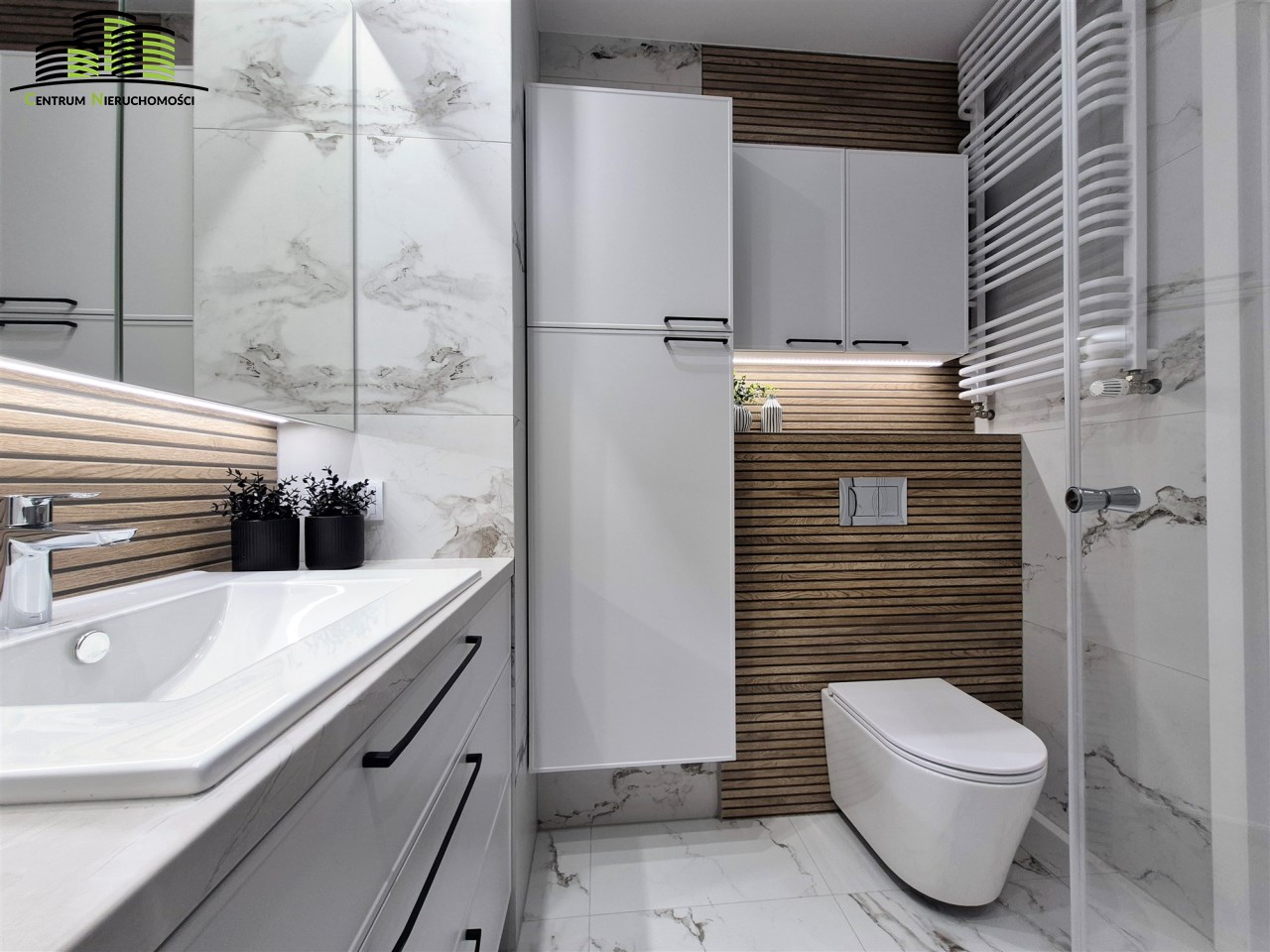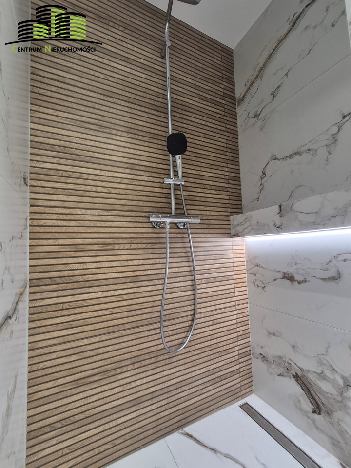 Łazienka – elegancka, z dużym prysznicem, wykończona w jasnych tonacjach.