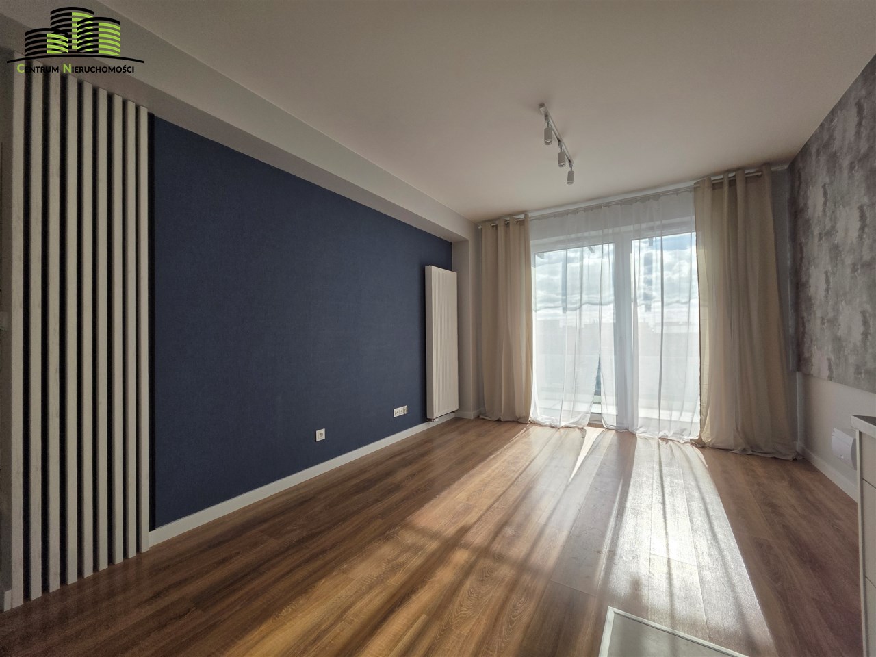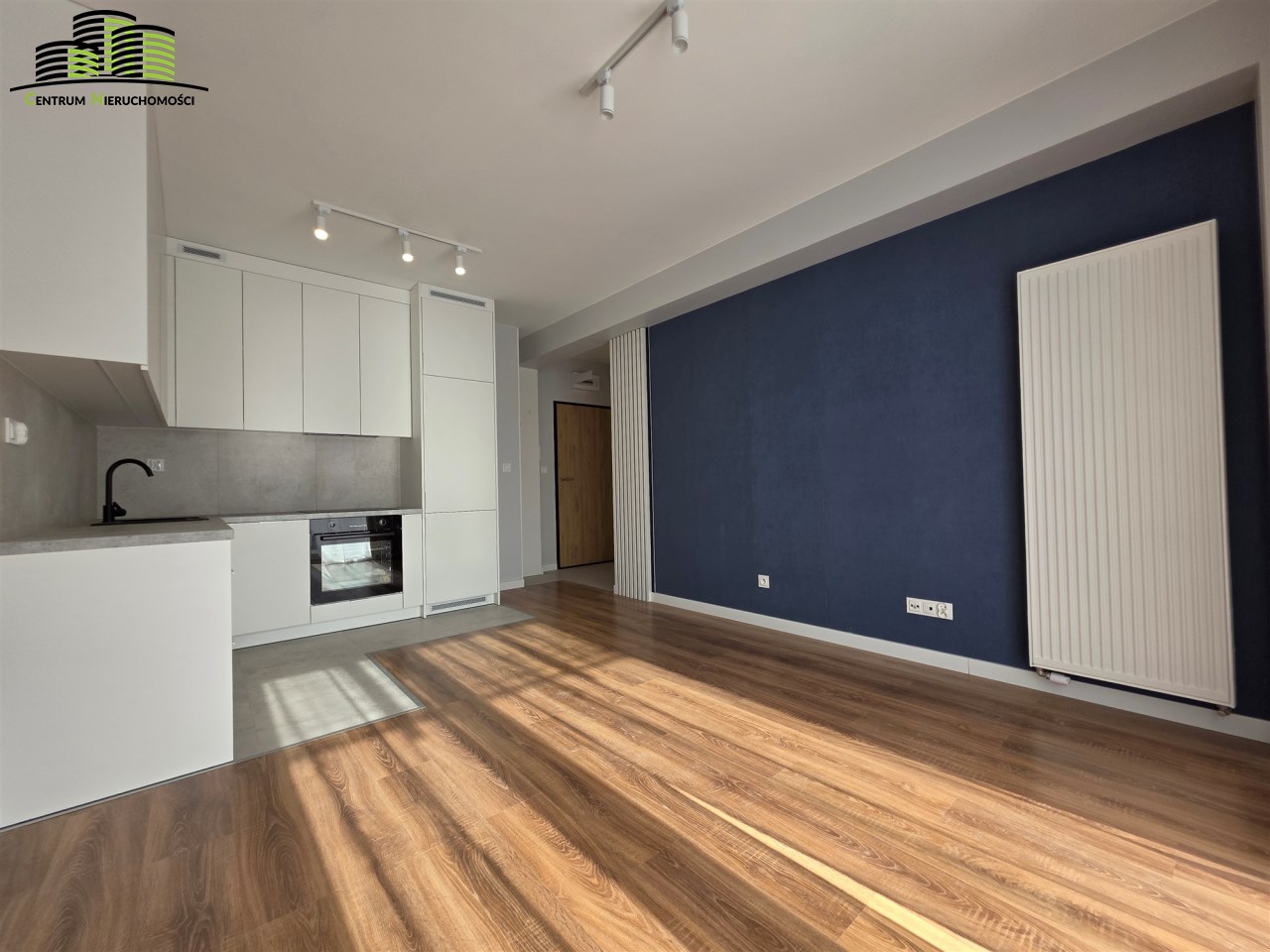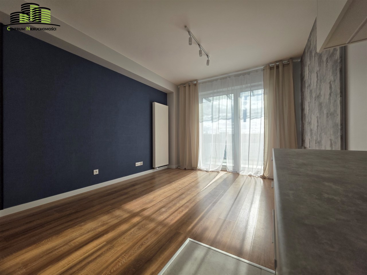 - Salon z nowoczesnym aneksem kuchennym i wyjściem na balkon.