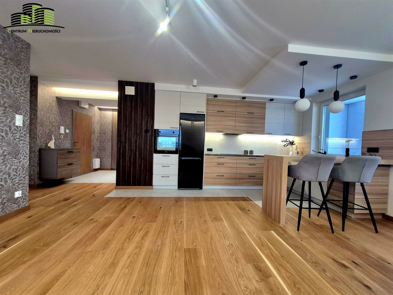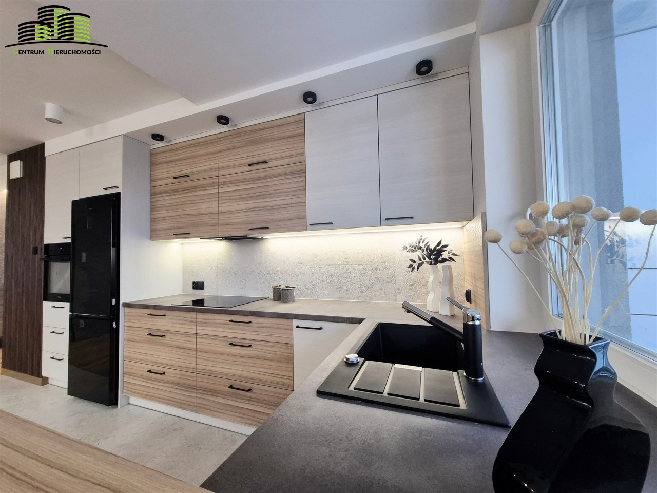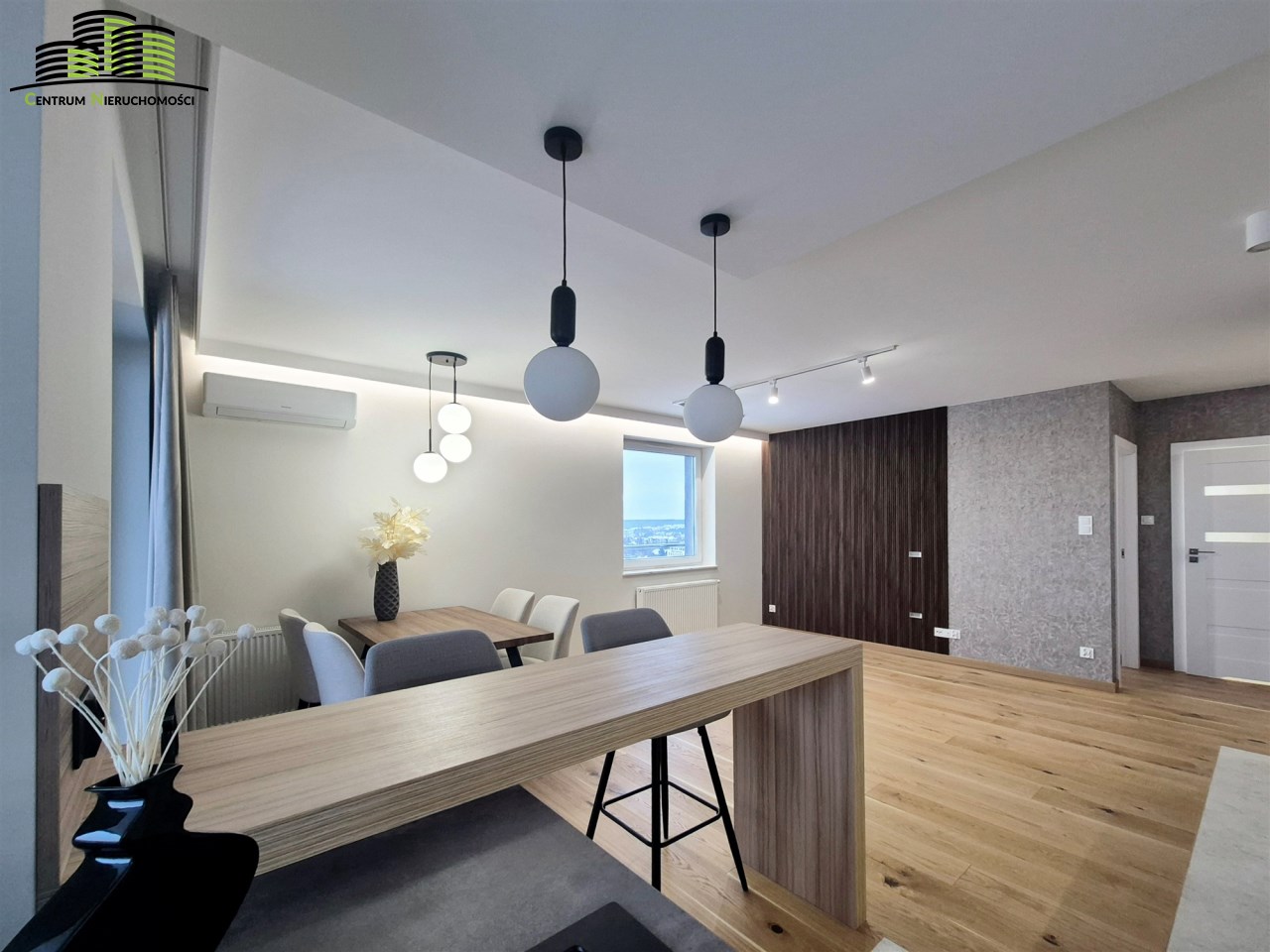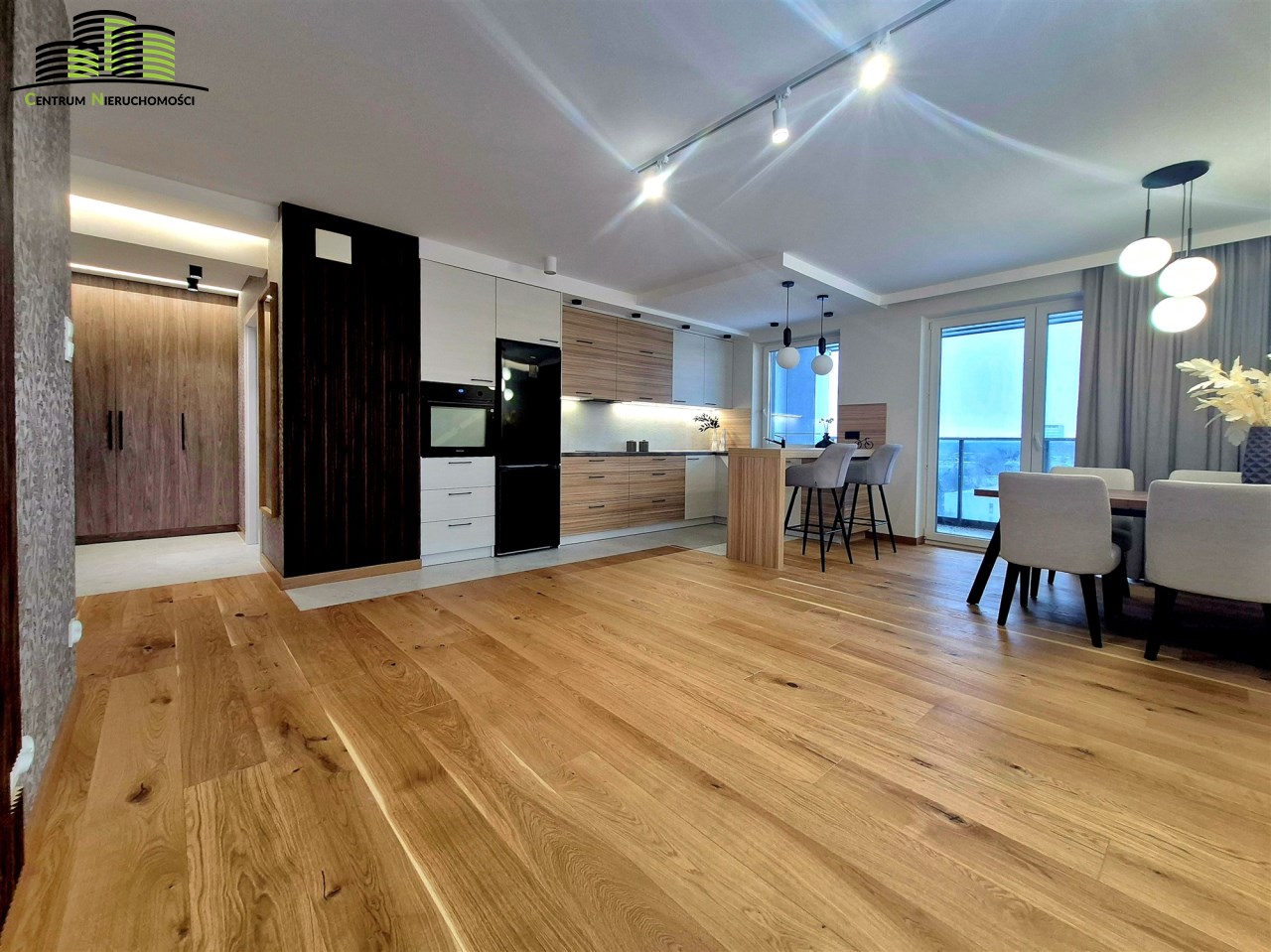 Mieszkanie ma powierzchnię 64 m² i zostało urządzone w wysokim standardzie z dbałością o każdy detal. Wnętrza są jasne, spójne stylistycznie i funkcjonalne. Naturalnym centrum mieszkania jest przestronny salon połączony z aneksem kuchennym, tworzący wygodną strefę dzienną. Duże okna oraz wyjście na duży, w pełni przeszklony balkon zapewniają imponujący widok na panoramę miasta oraz doskonałe doświetlenie wnętrz.
