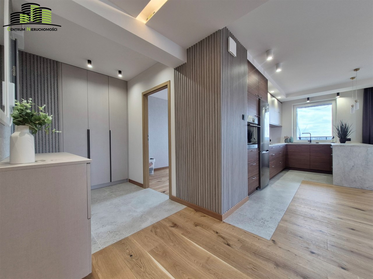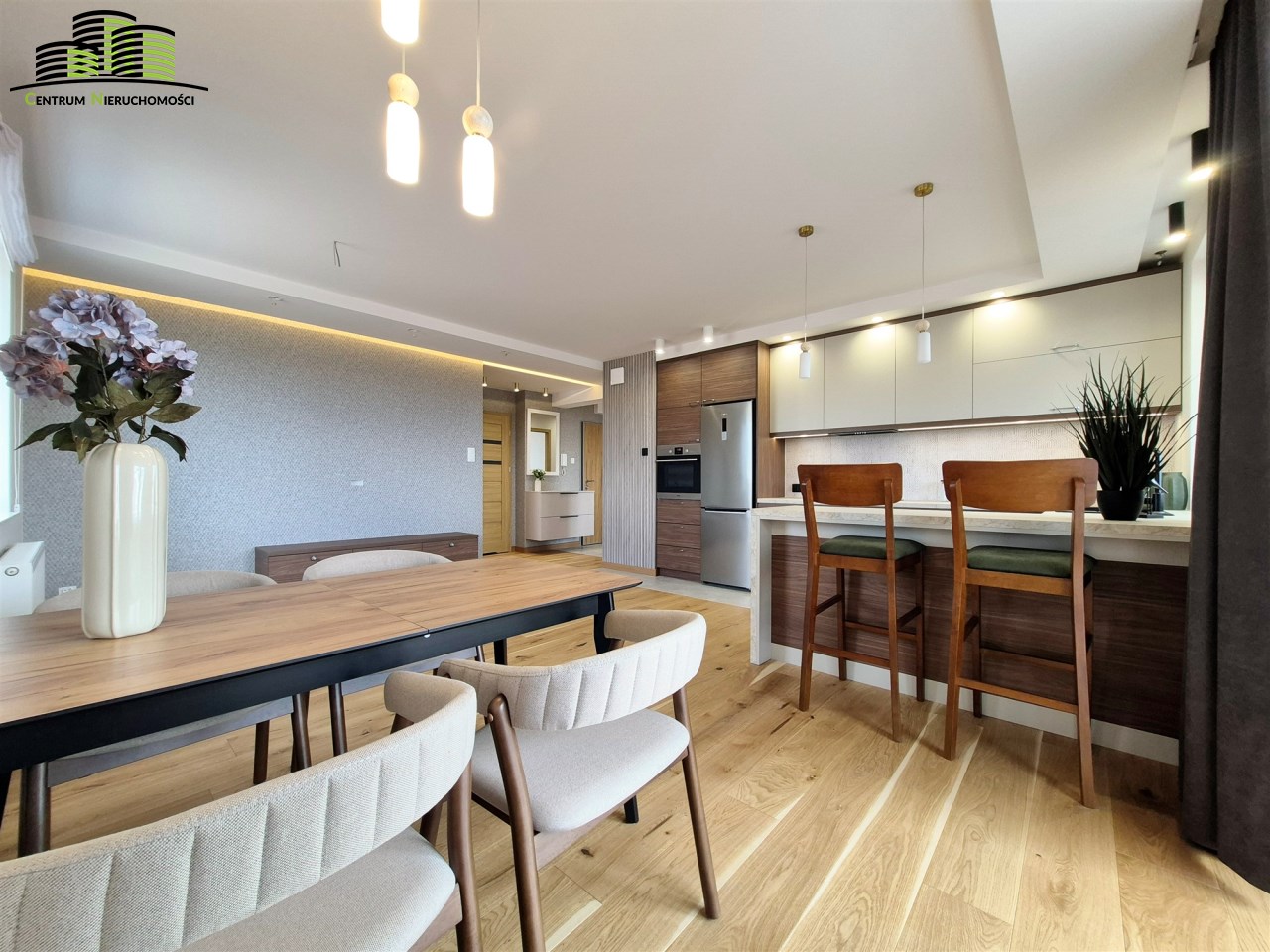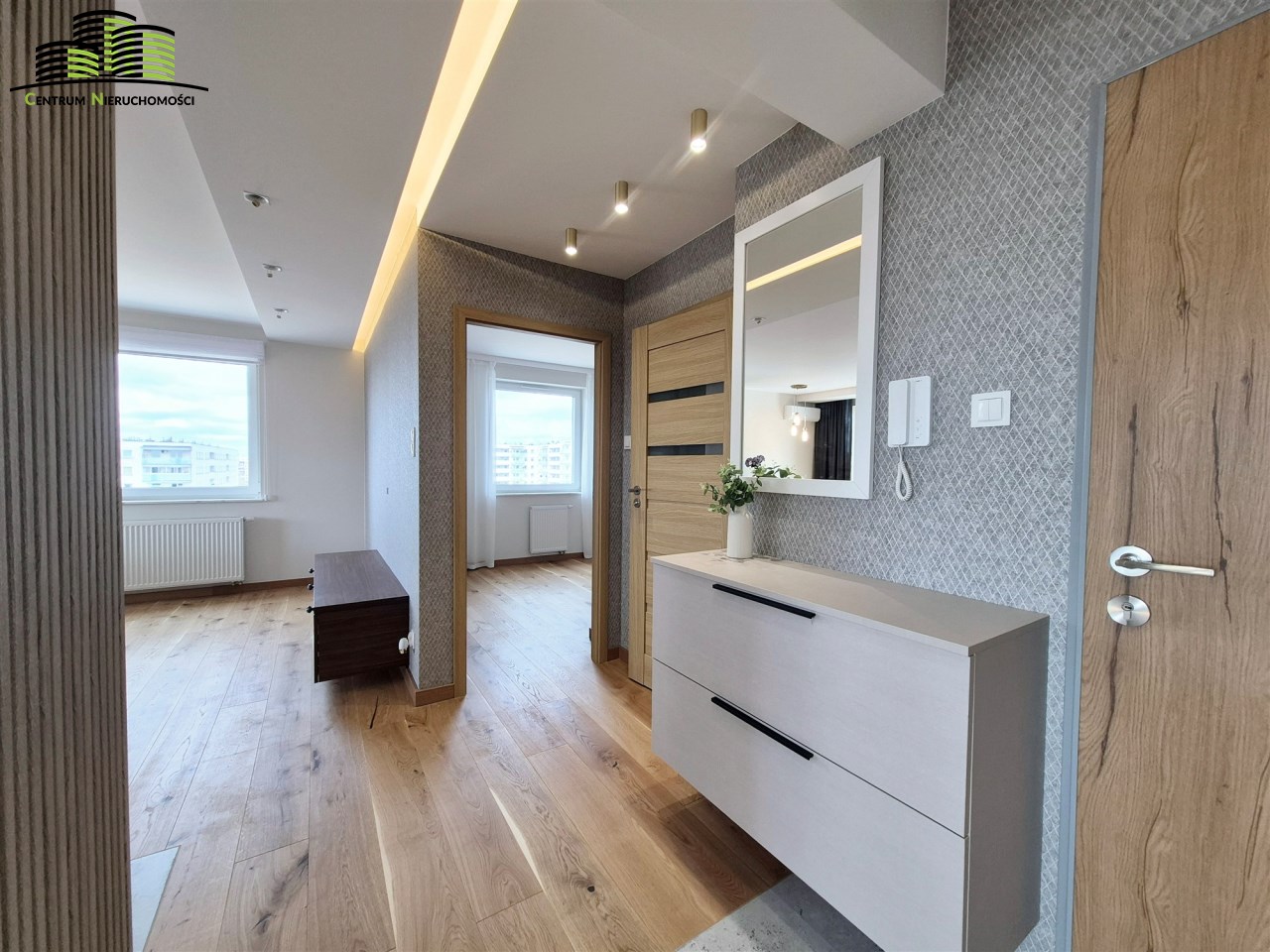 Mieszkanie ma powierzchnię 64 m² i zostało urządzone w wysokim standardzie z dbałością o każdy detal. Wnętrza są jasne, spójne stylistycznie i funkcjonalne. Naturalnym centrum mieszkania jest przestronny salon połączony z aneksem kuchennym, tworzący wygodną strefę dzienną. Duże okna oraz wyjście na duży, w pełni przeszklony balkon zapewniają imponujący widok na panoramę miasta oraz doskonałe doświetlenie wnętrz.